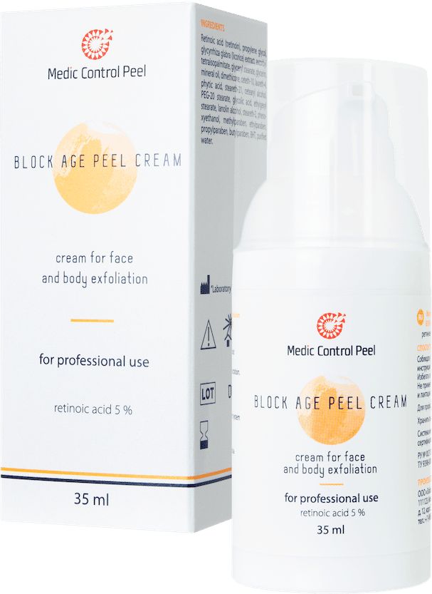 Block Age Peel Cream - ретиноевый пилинг (желтый пилинг), содержащий 5% ретиноевой кислоты, обладает уникальным механизмом действия – стимуляцией кожи без её повреждения. Работая на тончайшем рецепторном уровне, этот пилинг стимулирует клетки эпидермиса и дермы, что приводит к увеличению синтеза гиалуроновой кислоты и волокон коллагена, торможению работы меланоцитов, снижению выработки кожного сала, ускорению деления клеток эпидермиса и нормализации их дифференцировки, ускорению эпителизации. Является высокоэффективным и комфортным пилингом для омоложения, обновления и реструктуризации кожи.