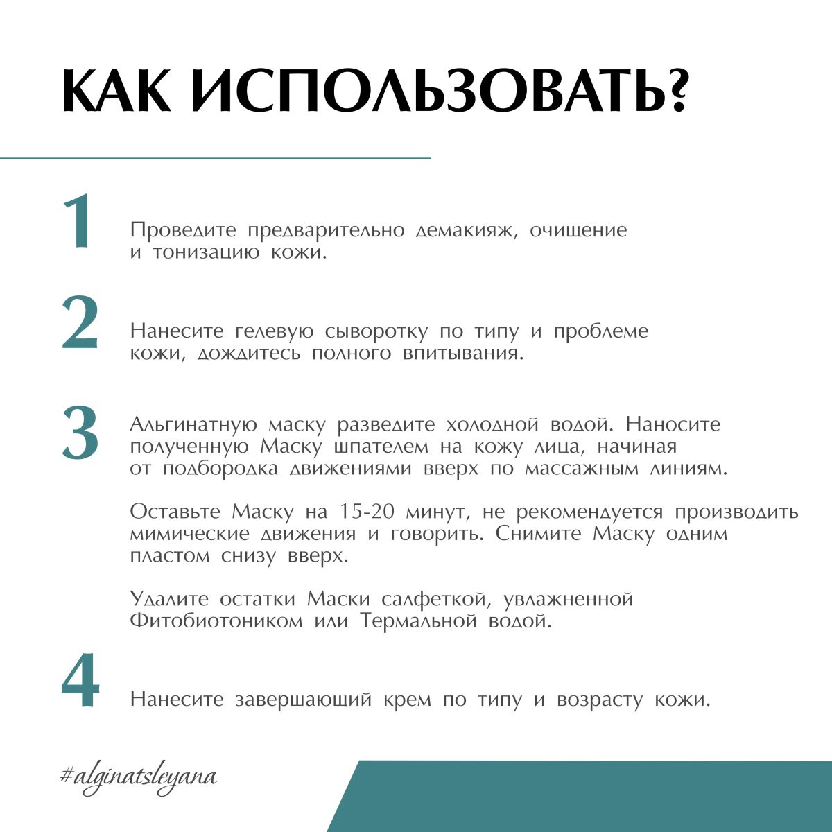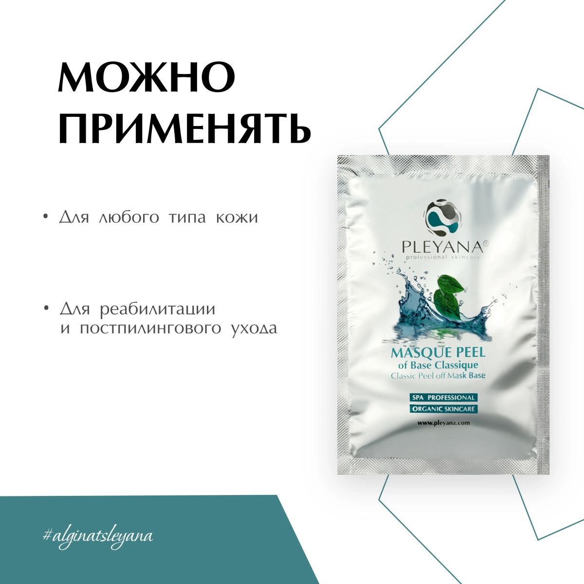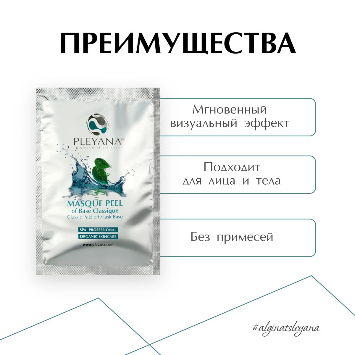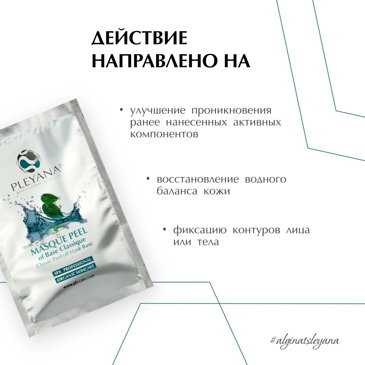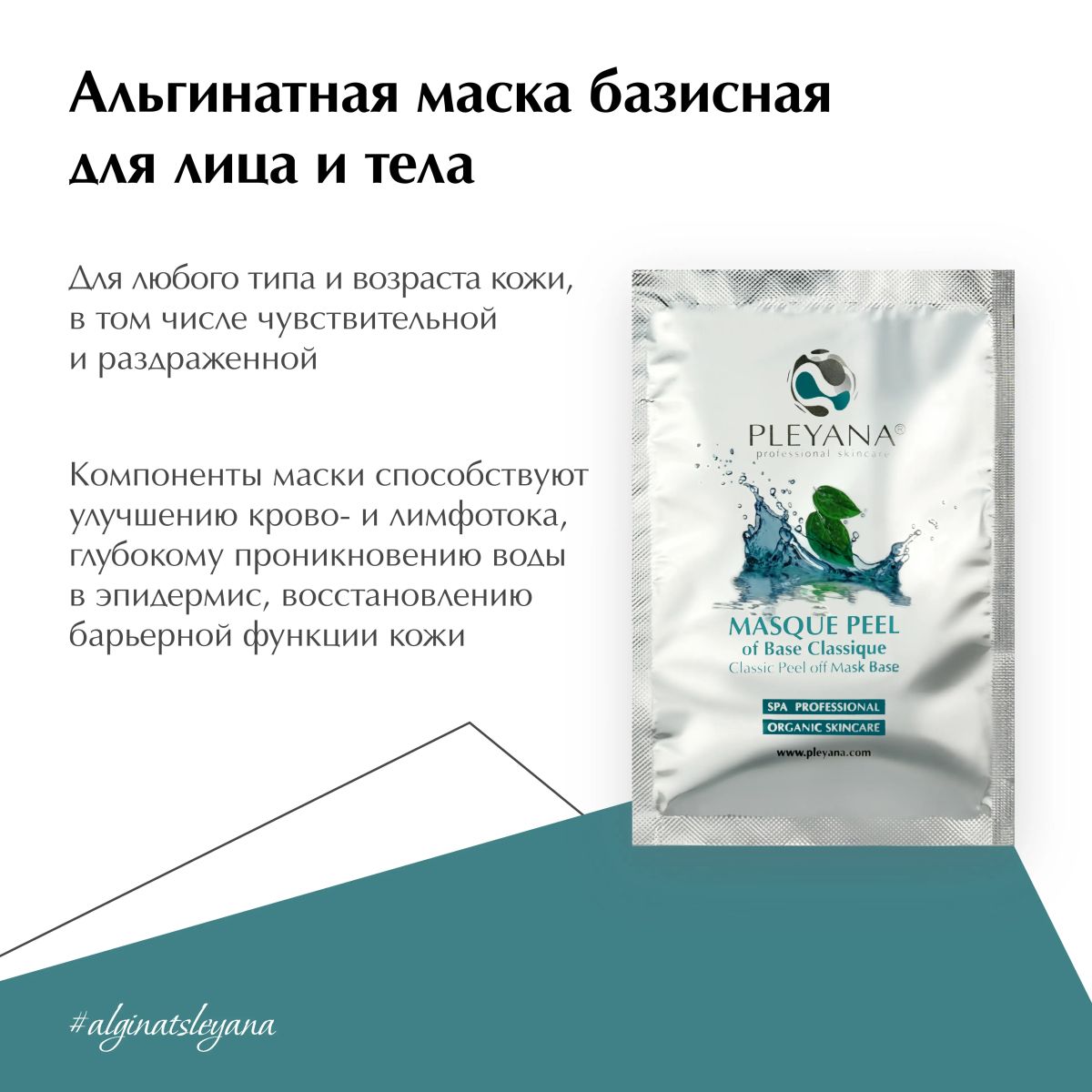 Пластифицирующая альгинатная маска на базе водорослей способствует улучшению крово- и лимфотока, глубокому проникновению воды в эпидермис, восстановлению барьерной функции кожи, обладает дренирующим, лифтинг и детокс-эффектами, усиливает действие, препаратов нанесенных под маску.