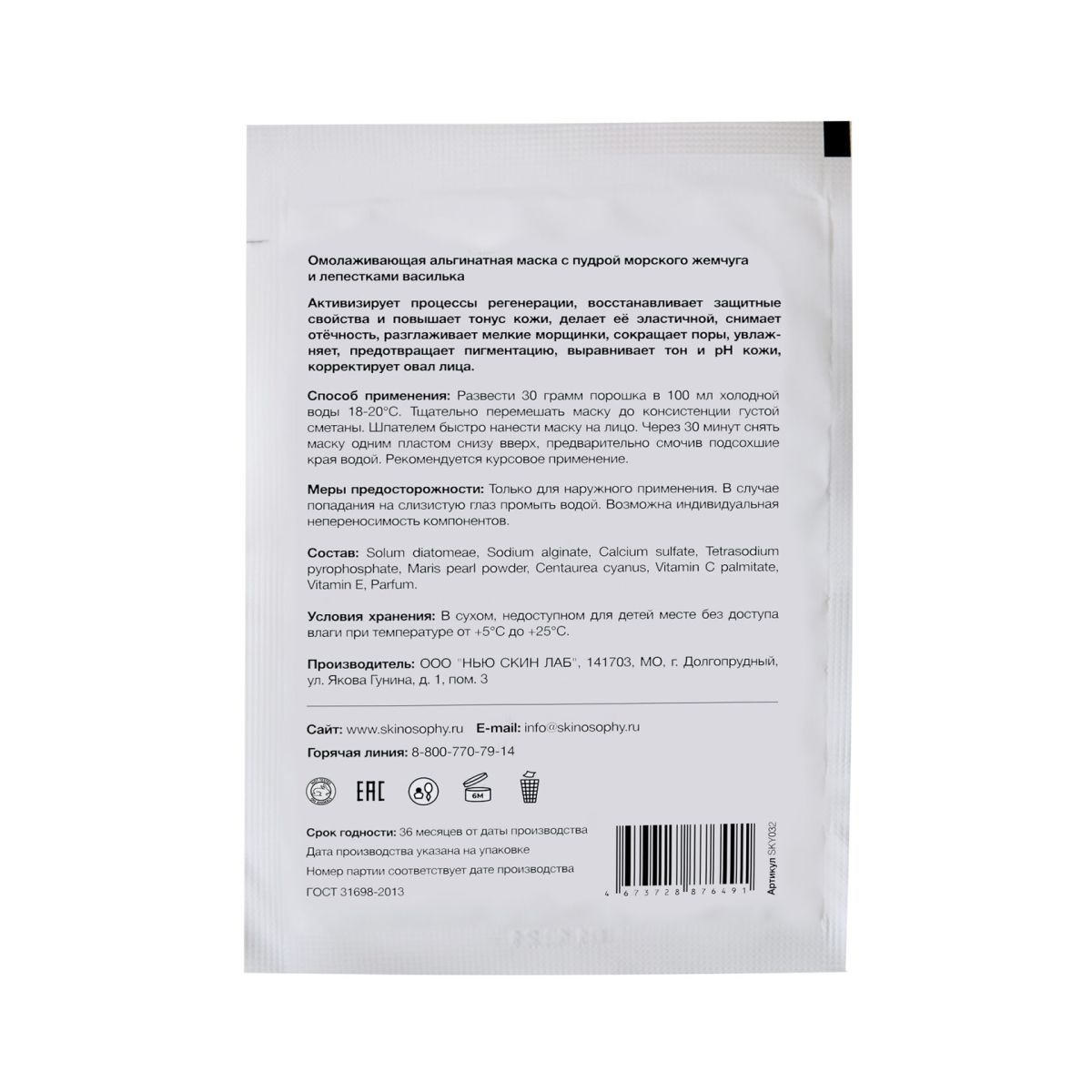 Альгинатная маска с пудрой морского жемчуга и васильком