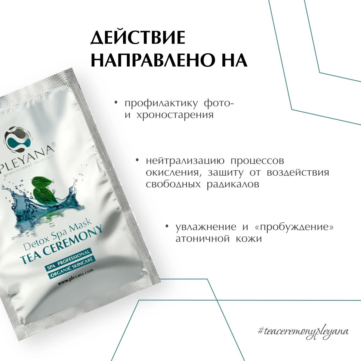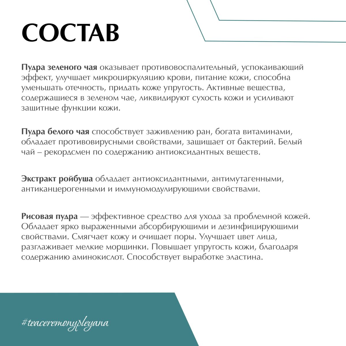 Органическая маска содержит различные виды чая, обогащенные витаминами, эфирными маслами, полисахаридами, биоактивными веществами, которые интенсивно омолаживают, тонизируют, мощно детоксицируют и усиливают защитные функции кожи.