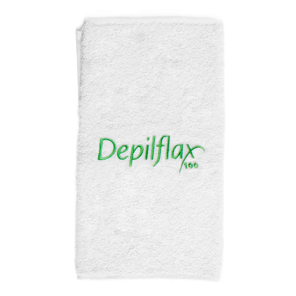 Небольшое махровое полотенце Depilflax100 с вышитым фирменным логотипом. Прекрасный аксессуар для салона и кабинета депиляции.