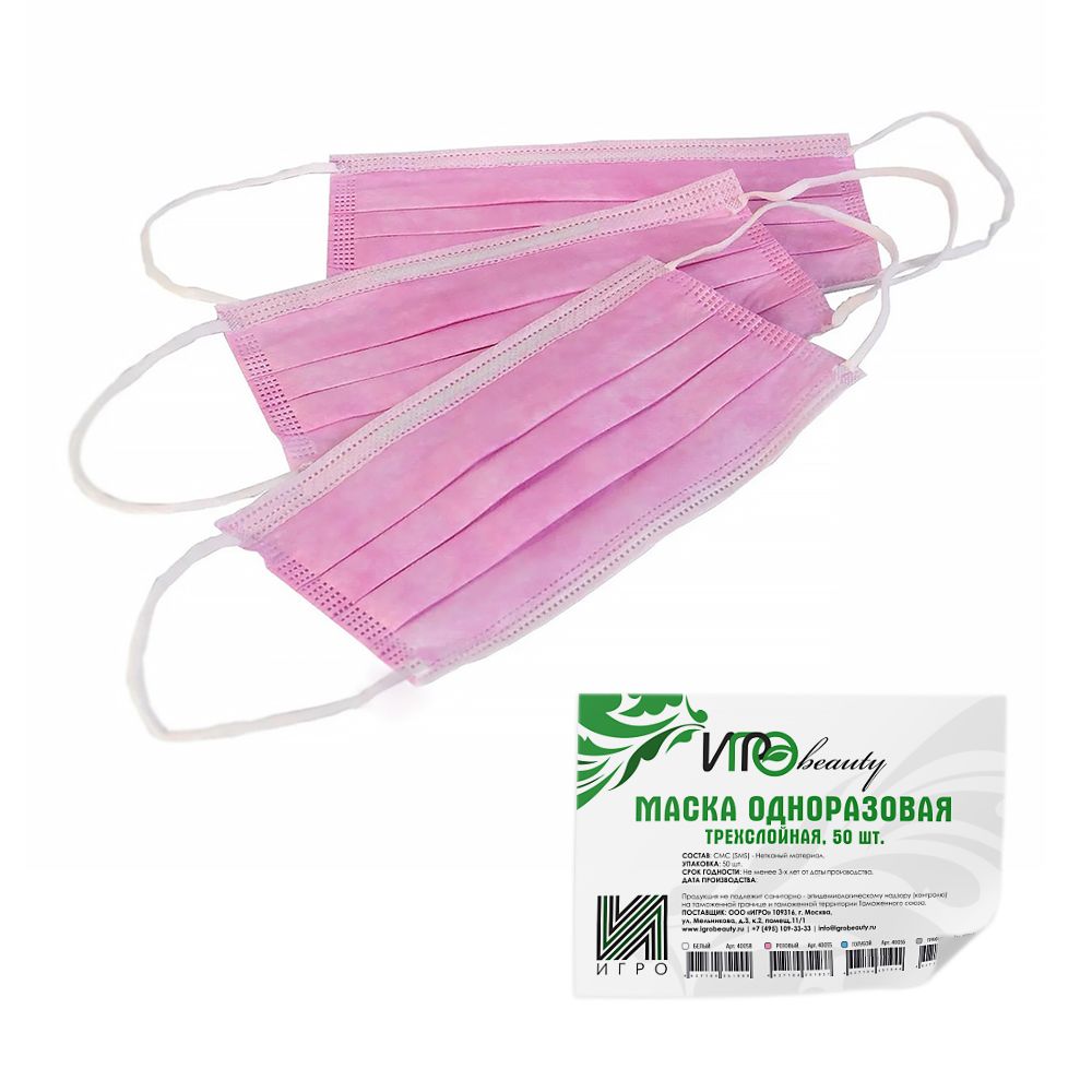 Маска 3-х слойная, одноразовая, SMS, цвет - розовый, 50шт.