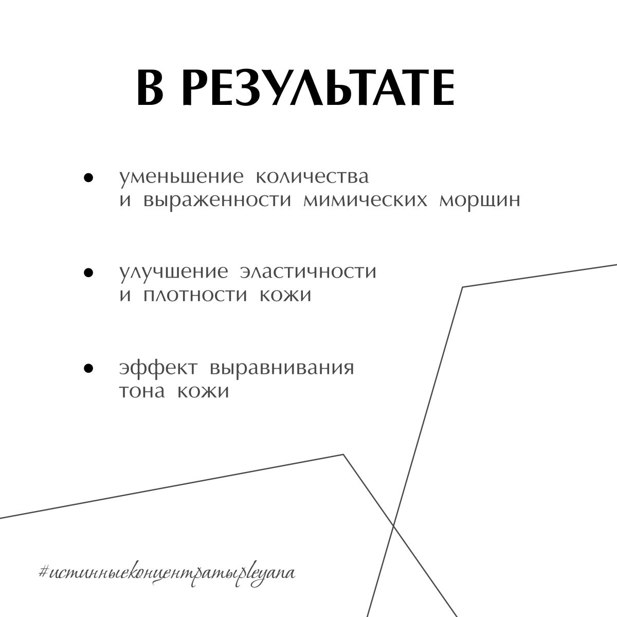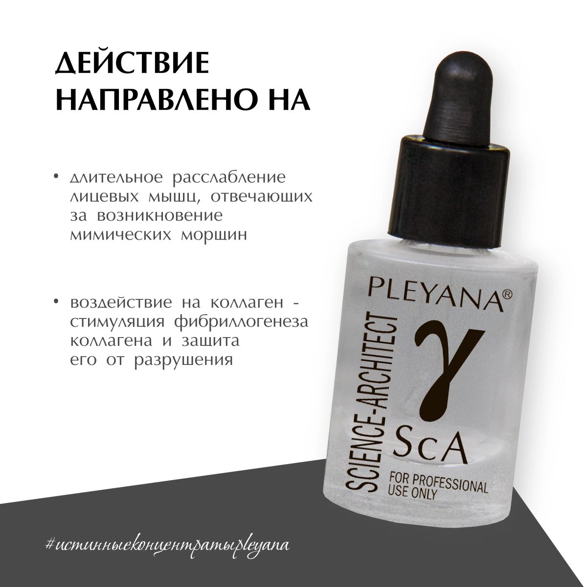Комбинация из 2 сигнальных пептидов направлена на ослабление нейронной сигнальной трансдукции и значительное уменьшение мускульных сокращений, мощную стимуляцию фибриллогенеза коллагена и одновременную защиту его от разрушающих энзимов. Концентрат может быть использован в программах для пролонгирования результата после инъекционной методики ботулотоксина, для профилактики и борьбы с мимическими морщинами.