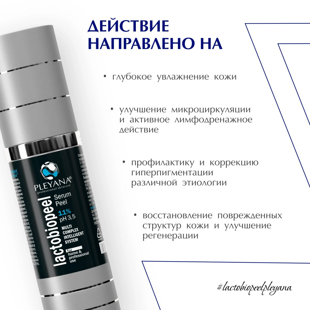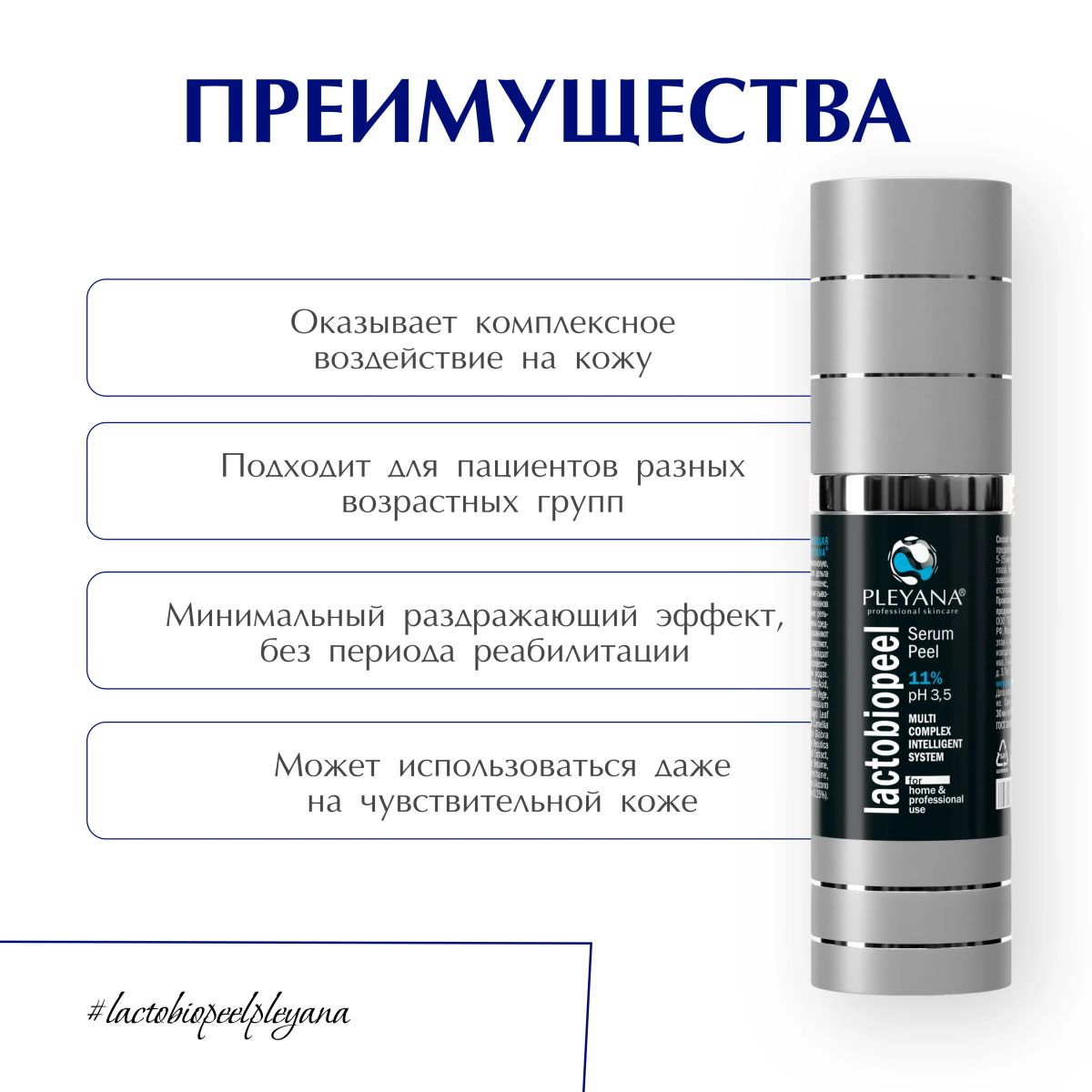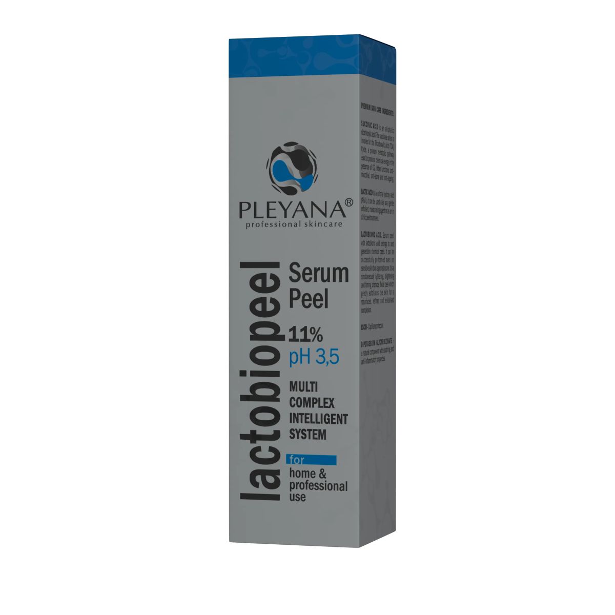Увлажняющая пилинг-сыворотка «LACTOBIOPEEL» PLEYANA 11% рН 3,5 для гидрореставрации кожи лица, шеи и декольте, относится к категории современных атравматичных препаратов нового поколения. Формула препарата включает лактобионовую, молочную и янтарную кислоты, глюконо-дельта-лактон, ангиопротектор эсцин, противовоспалительный компонент (дикалия глицирризинат), осветляющий компонент (глабридин лакричника), успокаивающий фитокомплекс.